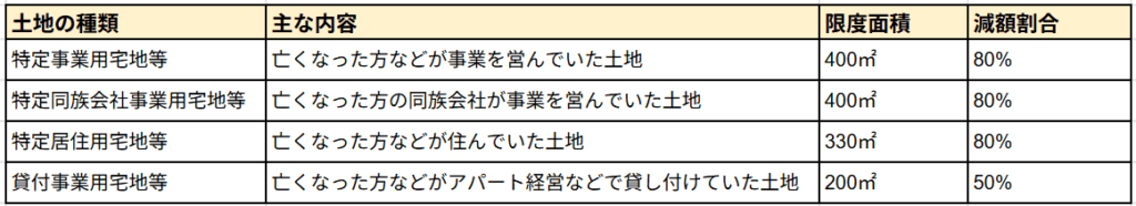 まず、特例の対象となる土地は、その利用状況によって主に4種類に分けられます。それぞれに適用できる限度面積と減額割合が定められています。