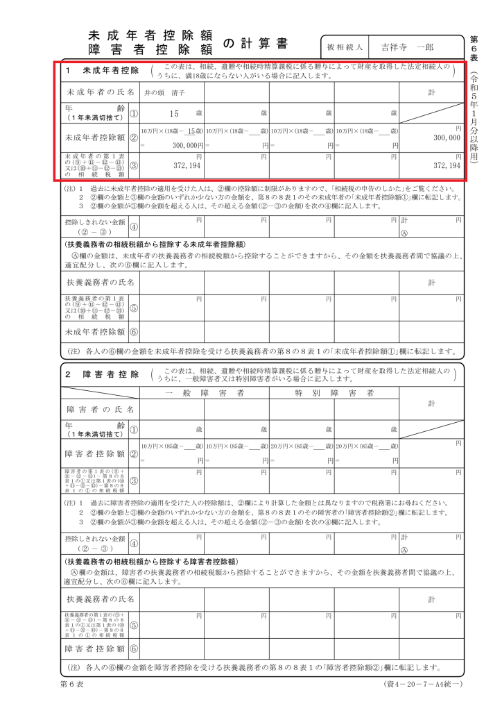 下の例ですと、井の頭清子さんは15歳なので、未成年者控除額は、(18-15)×10万円=30万円となります。